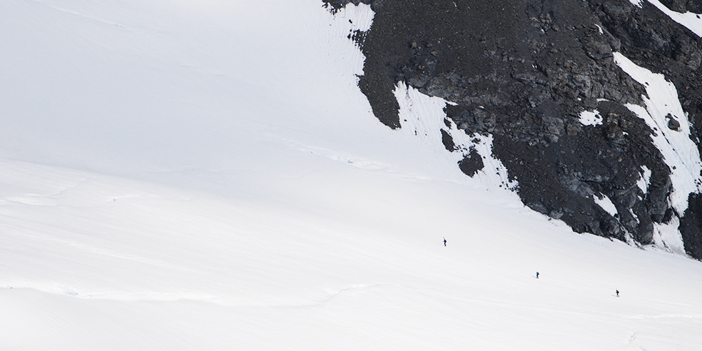 氷河での水平の世界から、雪壁の垂直の世界へ。装備も、ストックからピッケル、スノーシューからアイゼンに変わります。クレバス帯を抜け、心配していた落石に遭うことなく、稜線へ出ることに成功。