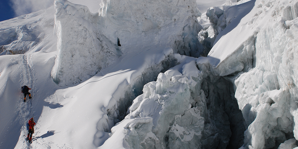 高所順応のため同じルートを何度も通過していると、クレバスの幅が変化していることに気がつきます。巨大な氷塊が動いている証拠です。