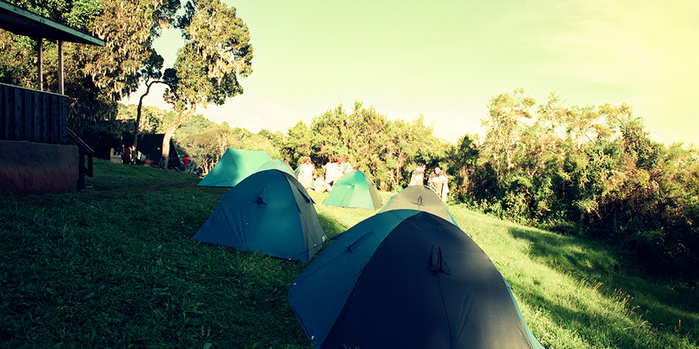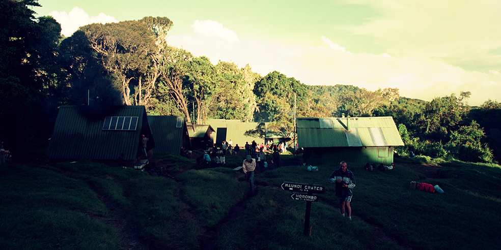 覆い被さる植物を見上げながら深呼吸し、耳を澄ませながら隠れている動物をきょろきょろ探し、立ち止まって足下の摩訶不思議な昆虫を見つめながら熱帯の自然を満喫します。レイチェル・カーソンの『センス・オブ・ワンダー』気分です。突然、西日が眩しい広場に出ました。初日の野営地、標高2,720mマンダラハットに到着です。
