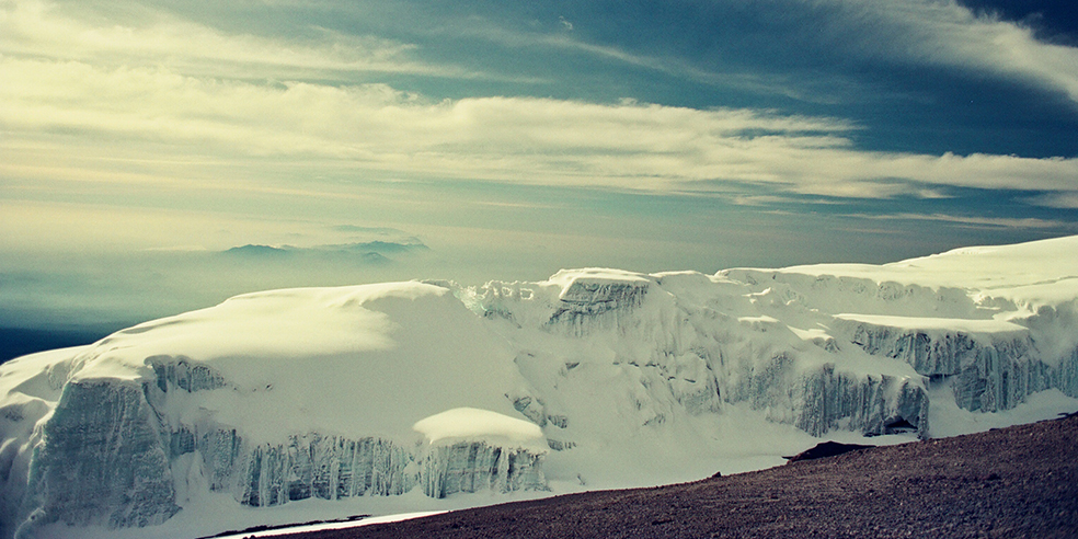 正面にはビルの高さほどの氷の塊、氷河が続いています。登山の途中で給水した、最終水場の湧水は、この氷河から溶け出した水です。