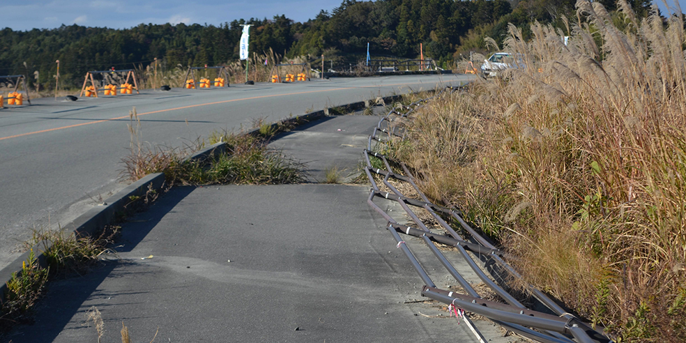道路脇の仮設歩道を自転車で通過している間、何台もの大型トラックが私たちの横を通り過ぎていき、辺りは砂埃が立ち込めるなか、かつてここが街として栄えていた頃の様子を思い浮かべてみます。目の前の景色は、7年半前の津波被害がいかに凄まじいものだったのかを物語っていました。