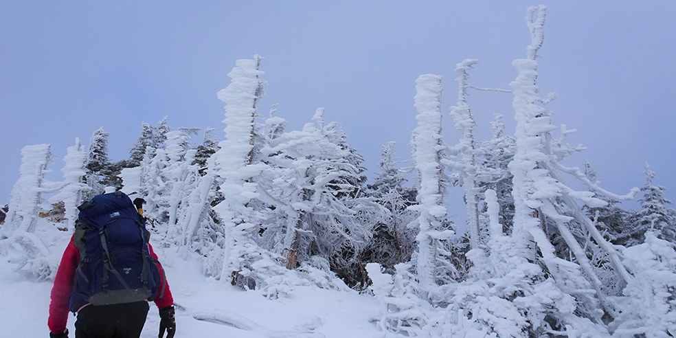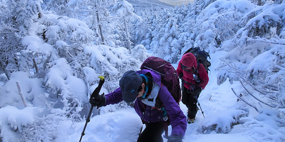 朝陽を浴びて煌めく樹氷や動物の足跡を楽しみながら、新雪を坪足で前進。無雪期に国道を車で移動していた時には気付かなかった僅かな起伏も、早朝の身体には少し堪えました。