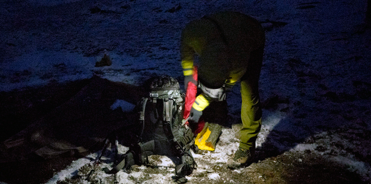 10一時的な雪かと思っていたのですが、夜になっても止まず、夕飯もそれぞれのテントで済ませました。夕食後外に出ると、雪にプラスして霧も発生しており、辺りが白く霞みがかっていました。先輩に声を掛けられ自分たちのテントのほうに目をやると、霧にボワっとテント内のライトが灯ってなんとも幻想的な光景…。晴れた時には見れない光景ですね。天候が良くなくても特有の山の楽しみ方があるんだなと、再認識しテントに戻りました。