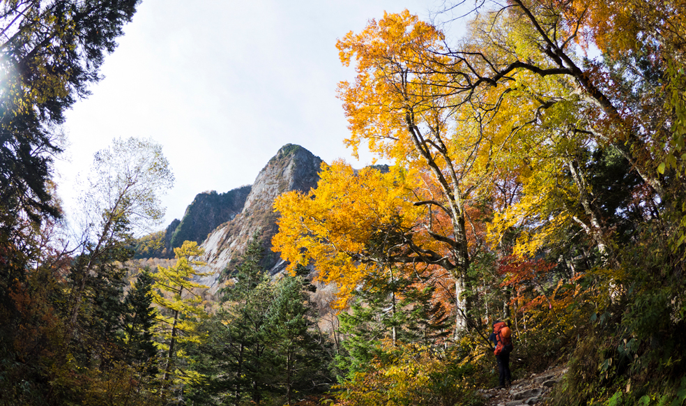 「涸沢」への道中。極端なアップダウンは無く非常に歩き易い山道でした。途中、迫力ある屏風岩が望めるポイントで、紅葉が素晴らしかったので足を止めて景色を楽しみました。「横尾」から「涸沢」まではコースタイムで3時間。体力の消耗が激しい中とはいえ、そこまでの長さを感じさせない飽きのこないルートに感じました。