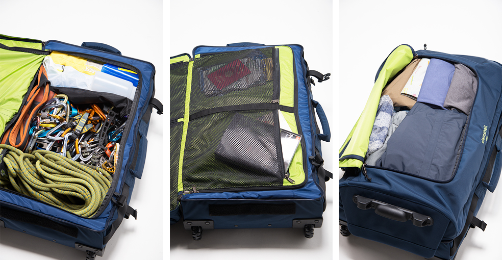 メインコンパートメント(写真左)にクライミングギアを収納した場合、インサイドオーガナイザー(写真中)には小物類を、フロントコンパートメント(写真右)には着替え等のウェアを配置。収納するアイテムを各コンパートメントで分けることで、荷物が多く雑然としがちな旅先で、アイテムの出し入れをスムーズに行うことが可能に。フィールドに出たらアクティビティに集中して楽しみたいですよね。パッキングだけでなく、旅先でも活躍する機能や仕組みが豊富に設けられているのが〈clamshell〉シリーズの魅力ですね。