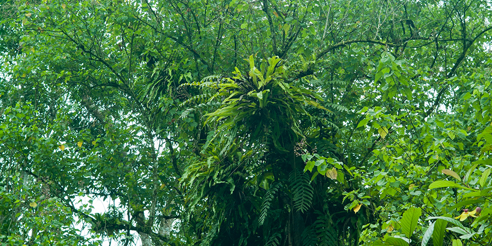 ふと頭上を見上げると、幹には無数の植物が着生していた。雨が多く、湿度が高いボルネオの熱帯雨林では、幹の上でも根を張る、したたかな植物が多い。なかには貴重なランや食虫植物もあり、研究者にとって垂涎の場所でもある。