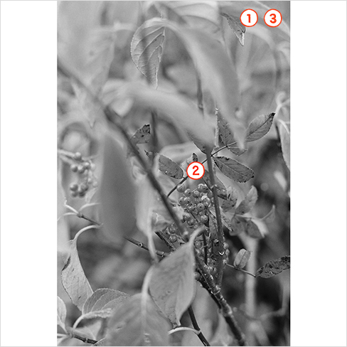 より「赤」を引き立たせる。 - ピント=ピントを合わせたナナカマドの実に